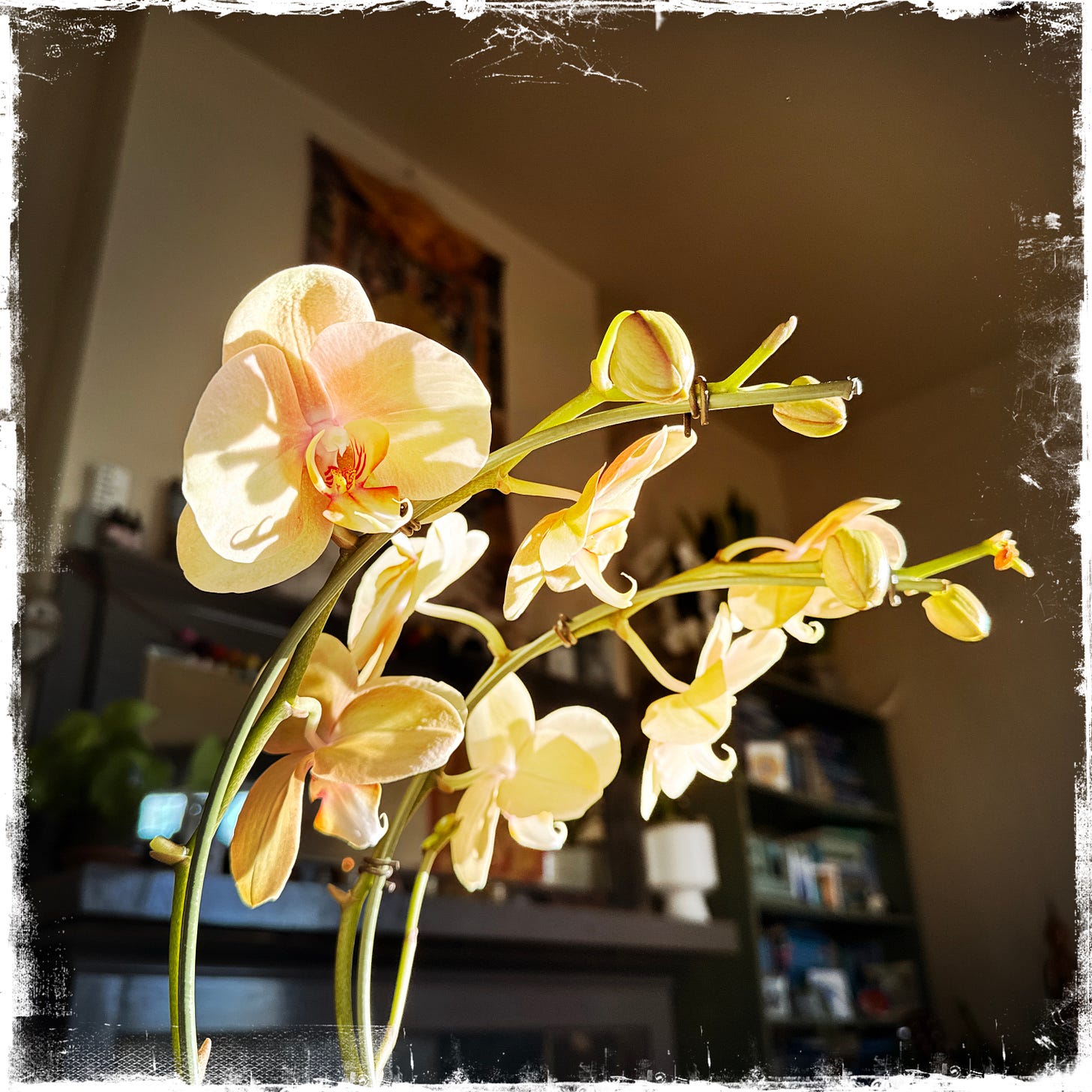10. The ground of language. The ground of poetry that, praise be, after reading so much for so many years, takes up a lot of space in my brain and inner dialogue. As much as I love the English language, there’s this longing for grounding in a language that offers a different worldview. An indigenous language with 70/30 verbs to nouns instead of our reifying opposite ratio in English. Language that shows the world alive, animate, moving, worthy of reverence and respect. Imagine that being implicit in the language, rather than implying objects to be dominated and used. Awe in this moment, as I see the shimmering gossamer spider strings on the pale pink orchid next to me, catching the morning sunlight. And all of that is alive and so much more verb than noun and I wish I could name that without so much clunky awkwardness.
